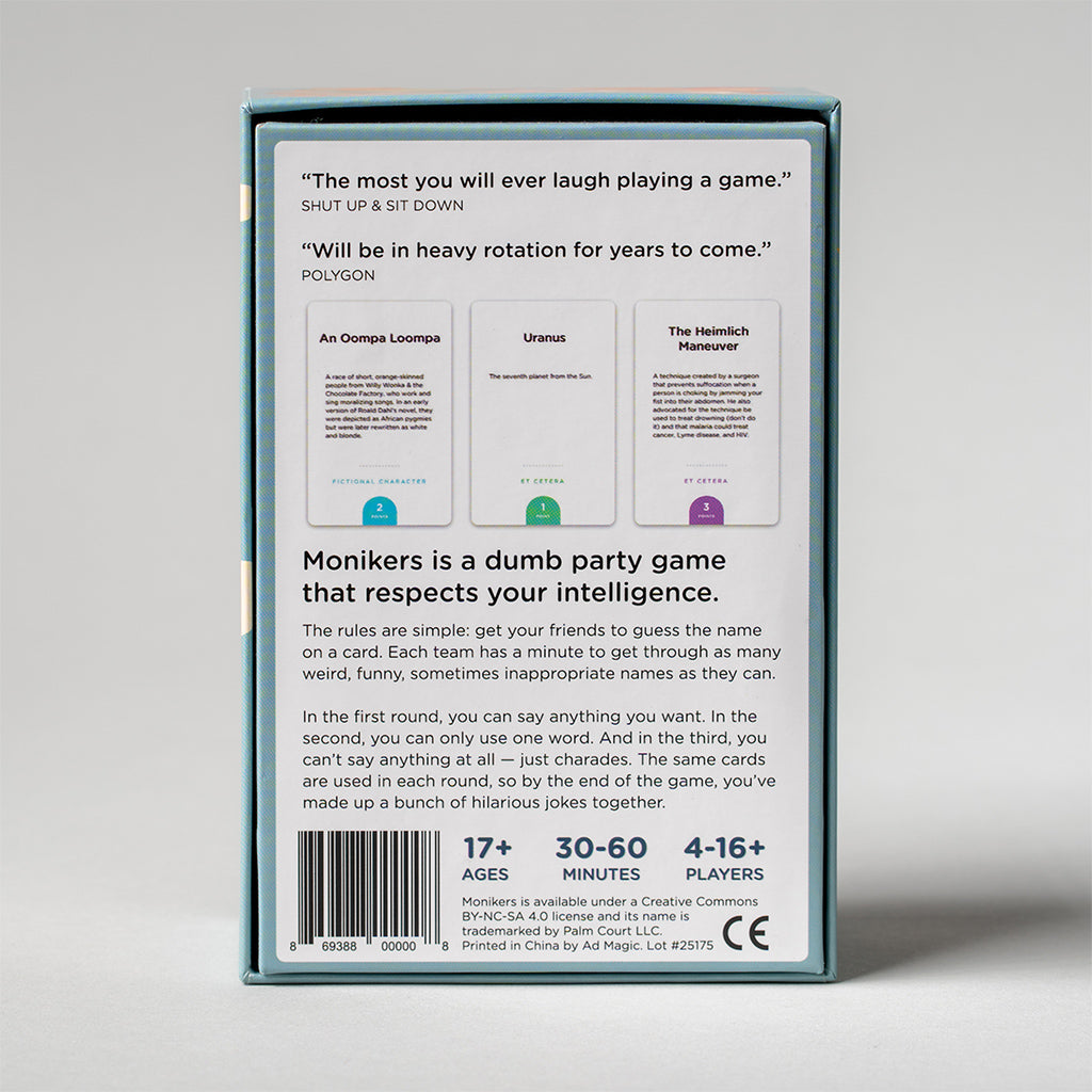 Monikers is a party game based on the public domain game Celebrity, where players take turns attempting to get their teammates to guess names by describing or imitating well-known people.