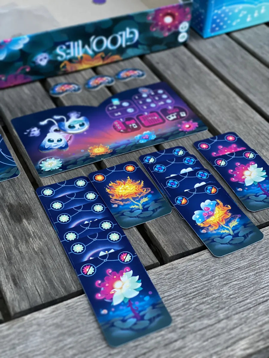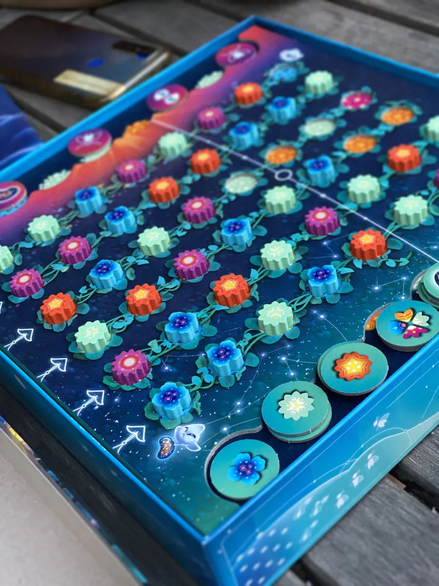 In the first half, you play cards to strategically place flowers on the board in rows, setting yourself up for good bonuses, then draw new cards. Once that's done, your discarded cards become your deck for the second half of the game. Play cards to strategically harvest flowers from rows, once again trying to set yourself up for good bonuses.